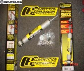 | CE 3-Way 90/10 Front Drag Shocks Ball Joint front end. Competition Engineering 3-Way Adjustable front Drag Racing Shocks for VW. Adjustable from: 60/40 for light street car or all out race car. 80/20 for street car or heavy race car. 90/10 This way the front will come up fast! For a street car in full street trim use! Or if you want to get the front end up in the air! If you do this you will have your pic in the mag! Most of the time!!!! $165 for the pair Package deal!! 1x set of QA1 rear single adjust shocks and a pair of CE 3-Way front shocks for $640.00 We also have limit straps, adjustable spring plates and retainers for your suspension needs!!! Link pin front ends please call |
