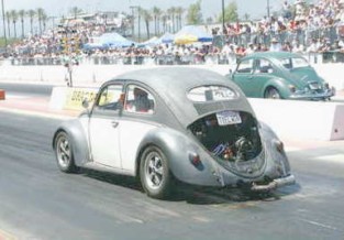 First off congrats to Scott Missbrenner for winning the top eliminator. The hole clan of racers that showed up and pit with us did very well. Kevin Reynolds ran some real good times with his RKC quality Kadron powered 1835 car. Eric and Kevin with their supergas Manx that has one of my extra turbo motors in it until we build them a new powerplant (Boost is fun and addicting but keep it lower than 20lbs!! ). The Overbecks ,Nick and Matt had a learning experience with their 1600T kit on a 1904cc motor (It takes time to make big power). Kai driving his dads 1776 turbo ghia was loving life( You will have your own turbo some day!!). Kenneth had tuff luck braking the tranny first round "dammmnn it". Dave from Proformance does not want to tear the motor apart yet, postpone the bad news, Still some fast as hellll times for that lead sled!! The Top man of the day was Scott and his 1915cc Kadron powered oval that screamed down the strip with a best of 9.24 and doing some big burnouts off the line. I notice that when Scott won, the group of us standing at the starting line screamed for him but half of the people looked at us as if we were on the wrong side. Sorry but Scott works with me and I know Mike would have loved to had that trophy under his belt, but that was Scotts first win and it couldn't of happend to a nicer guy. Best quote of the day was when we stopped Scott at the end of the return road and opened his door, "I Just Beat Muffler Mike" Mike has earned his name and earned it well and for Scott to take that crown is like David verses Goliath. As for myself, first practice was a little on the scary side. I did some research and changes to my carbs " For the good". The car came out of the hole so hard and pulled like no other time. I have always set my car up to wheelie, but only in first gear. To grab second gear with the wheels on there way down is crazy. The first pass the car was going straight until I grabbed second, at that time there was a slow drift to the left toward the wall. I could tell that it was not going to hit the wall, but was going to be close. Just as the car came down it jumped to the right and swung the rear out sending me toward the other wall, and into Ray Mejia's lane. Luckily Ray has a faster car and was out in front of me so it was a close miss. After that and some cold water and a new pair of shorts I was somewhat OK. Lee Gong had me but had a big red light, you ran your number though. Too bad Taylor red lit up against me because he had me so bad. I lost in the finals by red lighting with Ray Mejia taking the jack pot. I ran a best of 7.33 @92mph that day and had the best 60' ever with a 1.505 I did get $100 for the fastest Kadron for the day and $50 for runner up in the Jackpot class. I am not going to Colorado due to saving my money to by some beach front property in Arizona. Thanks to Rich Kimball and all of his helpers for the fun. Can we do a Bug-In night race next time? I hate that heat!!! Back to the Kadron Klass |