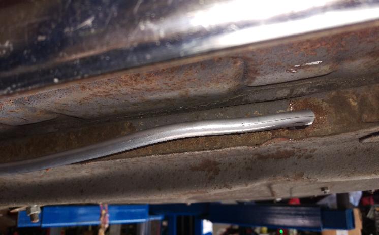 We like to use 3/8" fuel aluminum line that comes in your kit. Here you can see that we drilled a hole on passenger side rear near jack point to make a pass-through for the line to go behind and under jack point on Eric's Bug. We later installed clamps to hold and secure the line for safety.