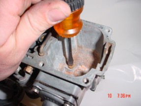 Start by removing air cleaners from the tops of the carburetors. This will give you access to six screws on top of each carburetor. Remove the top of each carburetor but be careful not to damage the gaskets as you will want to reuse them. The needle valve sits above the float attached to the underside of the top half of each carb.Unscrew to remove or replace. Now remove the float assembly which will consist of three parts. If the carburetors have been recently used, there will be gas within the float bowl. Gas does not need to be removed as it will not leak when you remove the main jet. The main jet is at the bottom of the float bowl. It can be removed with a flat head screwdriver, turning it counterclockwise. To install or reassemble, follow above directions in reverse. Make sure to remember to install the float assembly (as I have done this once or twice!!!). |