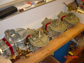 Some Turbo prep 500cfm and 350cfm carbs. We spend about 2-3 hours per carb to do all the tricks and get them to run for a turbo combo out of the box for you. We will take a batch of carbs apart but build them one at a time. Notice the red blocks near the float bowl in some of the pics? Thats the main jet adjustment screw that we add to all of our Turbo-Prep carbs. |