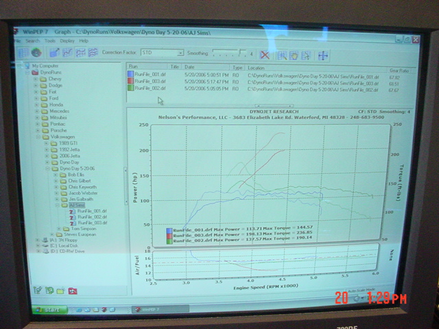 to the dyno! But once on the dyno first pull was at 5lbs boost, made 113.71hp and 144.57 tq Next was 9lbs boost made 137.57hp and 190.14tq Last was at 12lbs on pump gas still made a best of 198.13hp and 236.85tq at the wheels! Max power was at 4,300 rpms. If you add 12% for power loss do to gear box thats over 220hp and a stump pulling 264tq at the flywheel!!! Not bad for a car that drove from CA! |